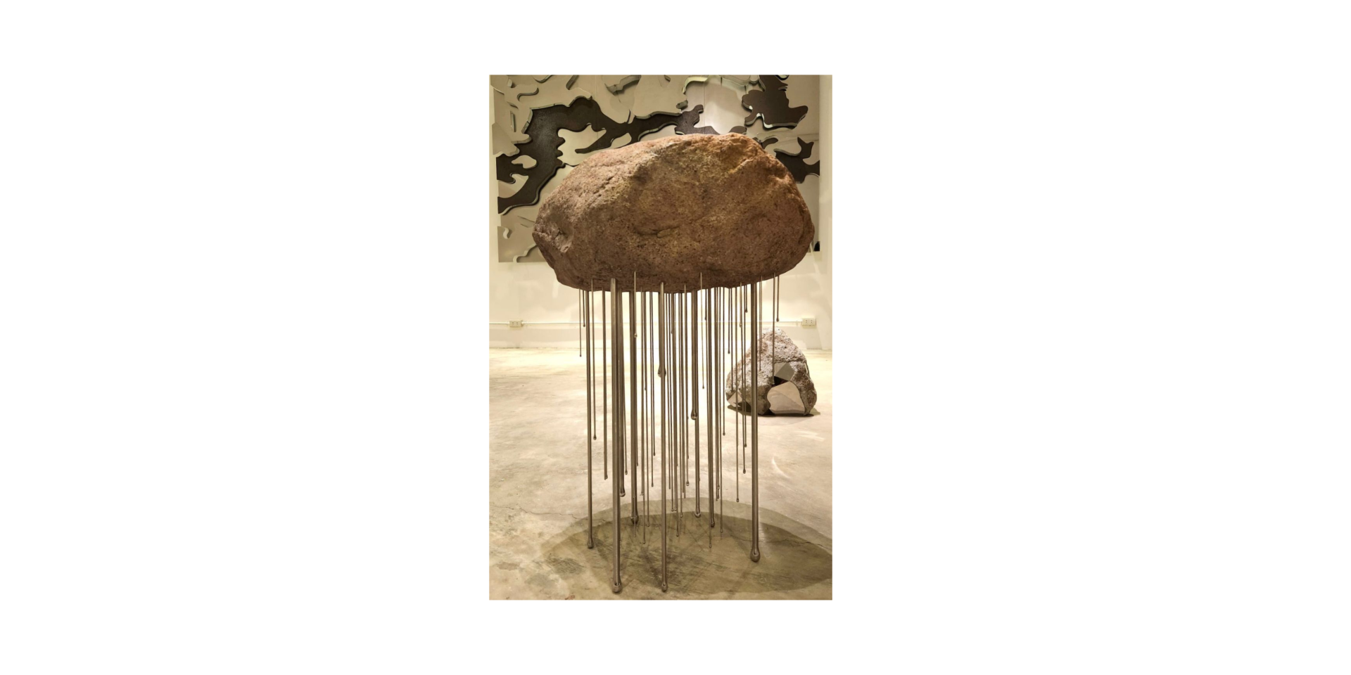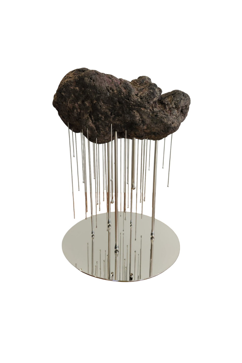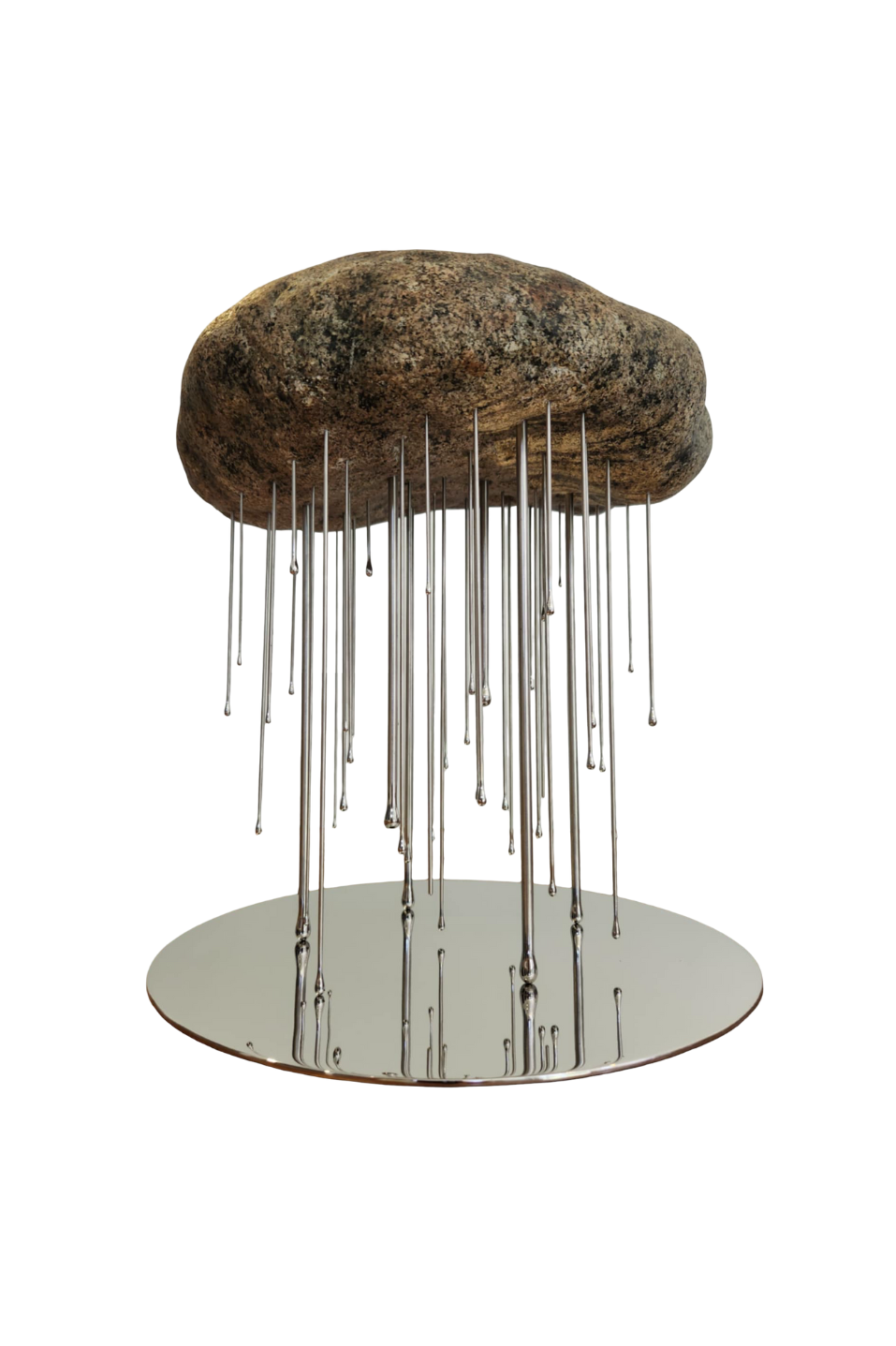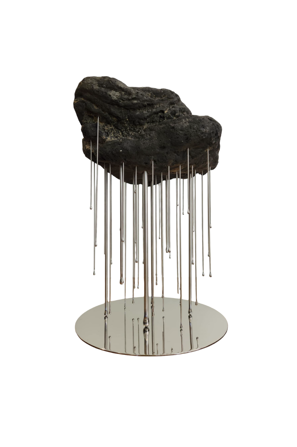 Reg’s latest series, Nimbus, was born during the pandemic while living near the volcanic uplands of Alfonso. There, surrounded by nature and constrained by limited industrial materials, he turned to the primordial elements of his environment—volcanic rock, boulders, and flowing water—as both medium and metaphor. In Nimbus, clouds are reimagined in solid form, suspended above ground by delicate steel rods that mimic rain, speaking to the quiet forces of gravity, erosion, and transformation.